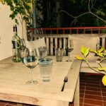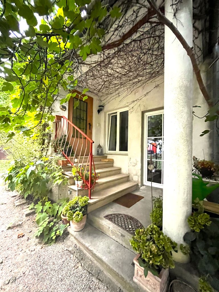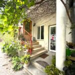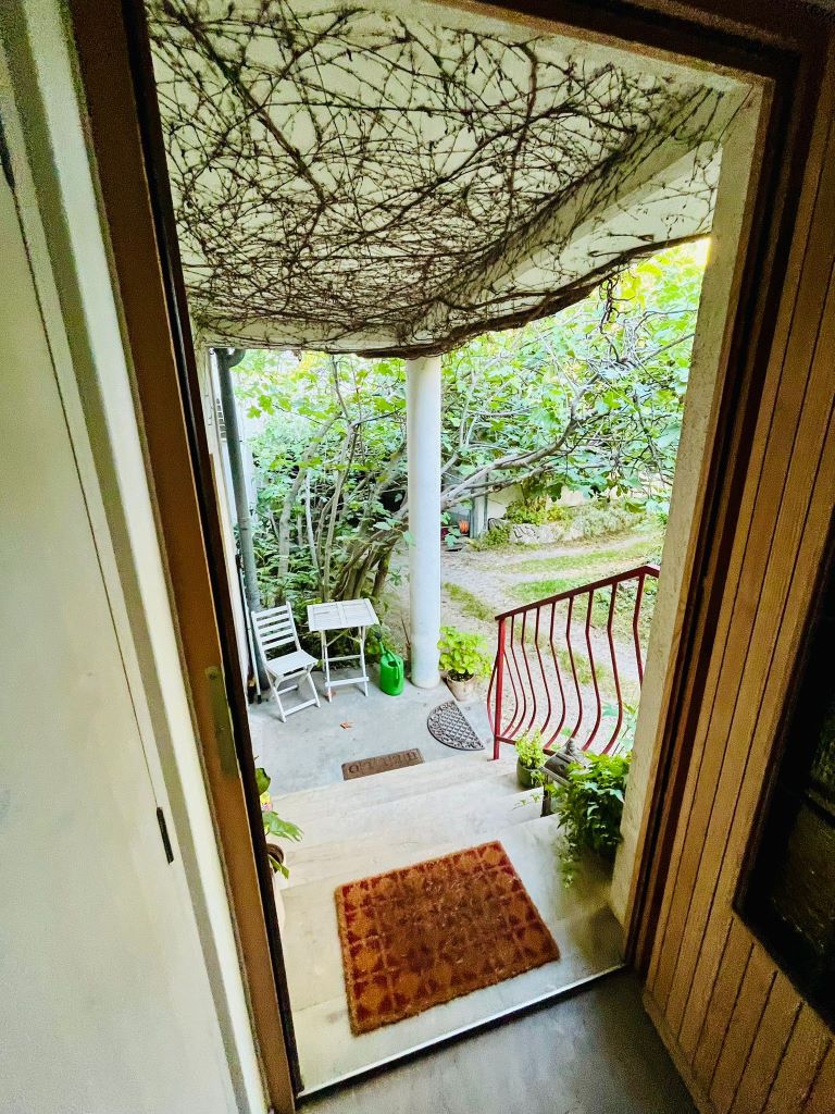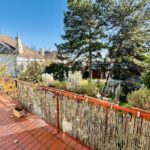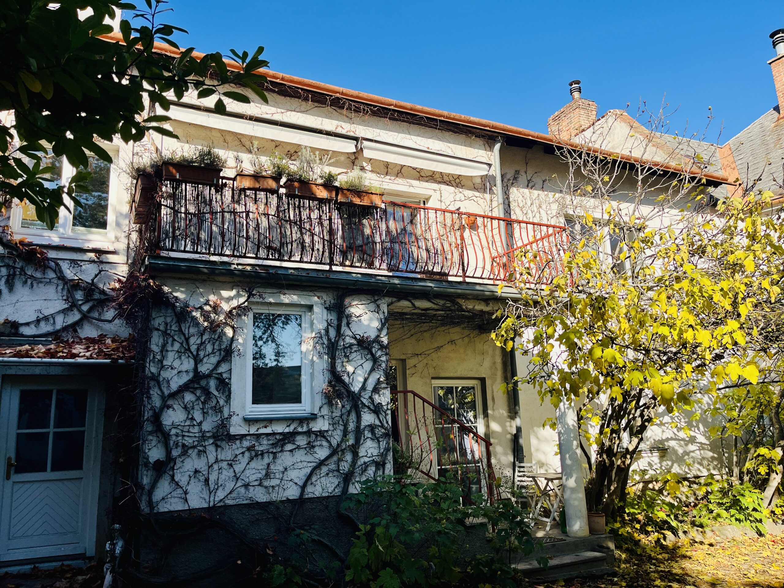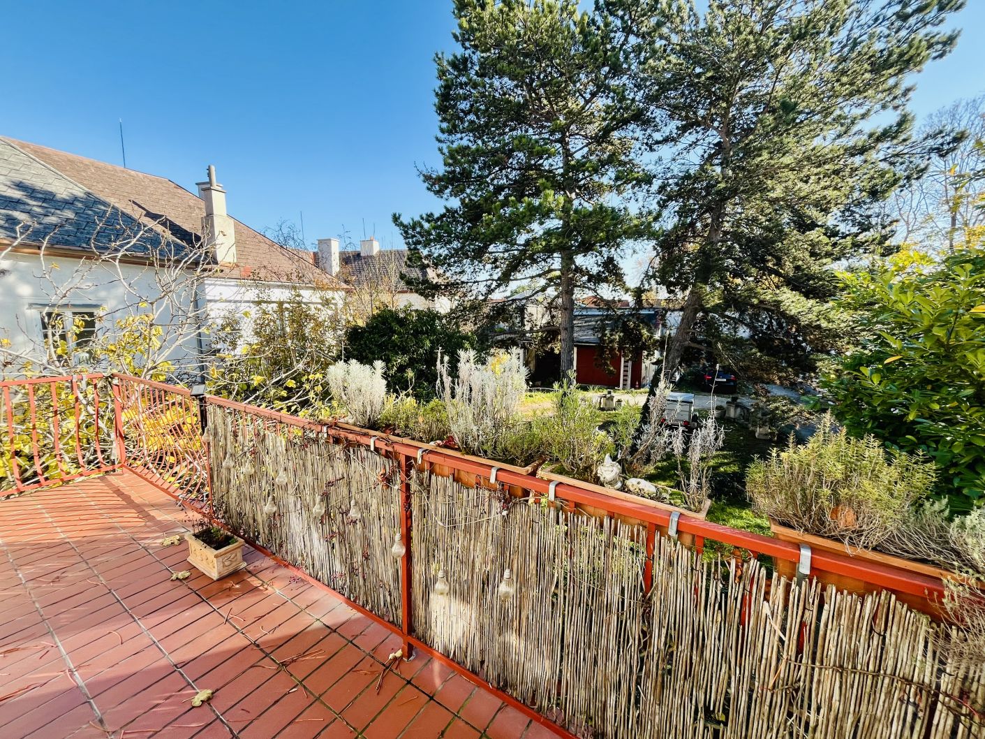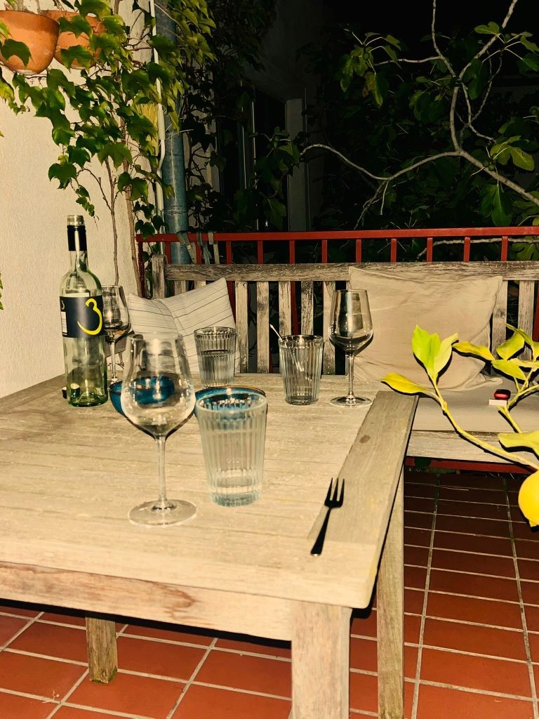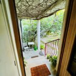 Der Balkon ‚thront‘ wie eine Aussicht über dem mit Altbaumbestand begrünten Innenhof, unterhalb wachsen die Feigen und Markisen geben im Sommer Schatten.