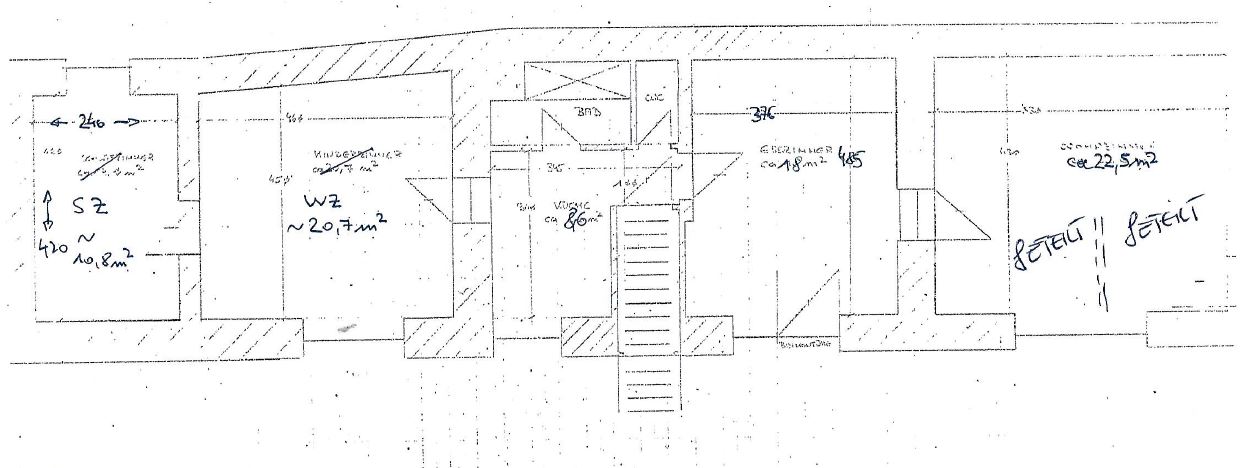 Das Wohn- / Ess- Zimmer mit Zugang zum Balkon ist mit der Küche zentral gelegen, sodaß die Schlafzimmer / Jugendzimmer voneinander entfernt Privatsphäre gewährleisten.